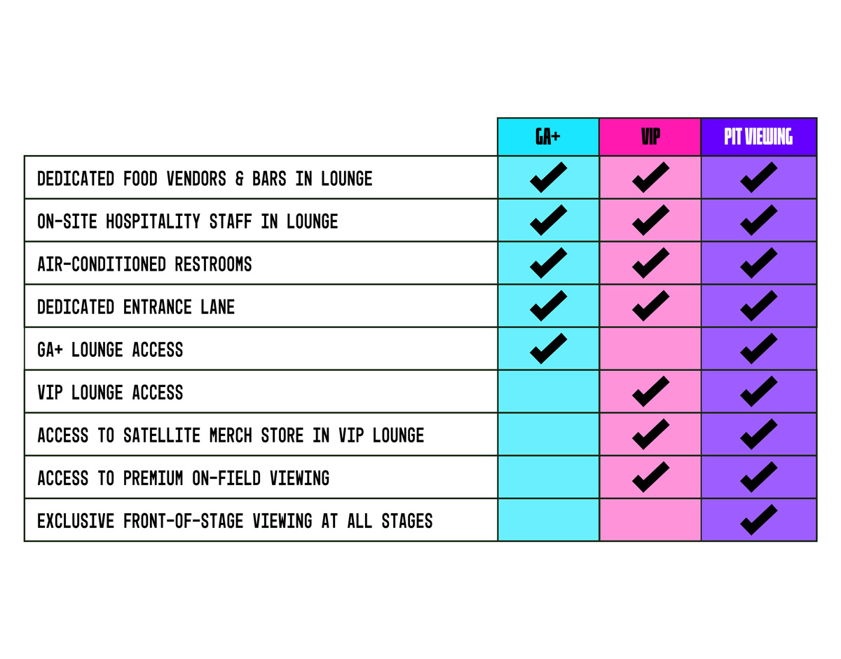 Unlimited access to large, shaded VIP Lounge located between Main Stage and Second Stage with relaxed seating and direct access to on-field viewing.